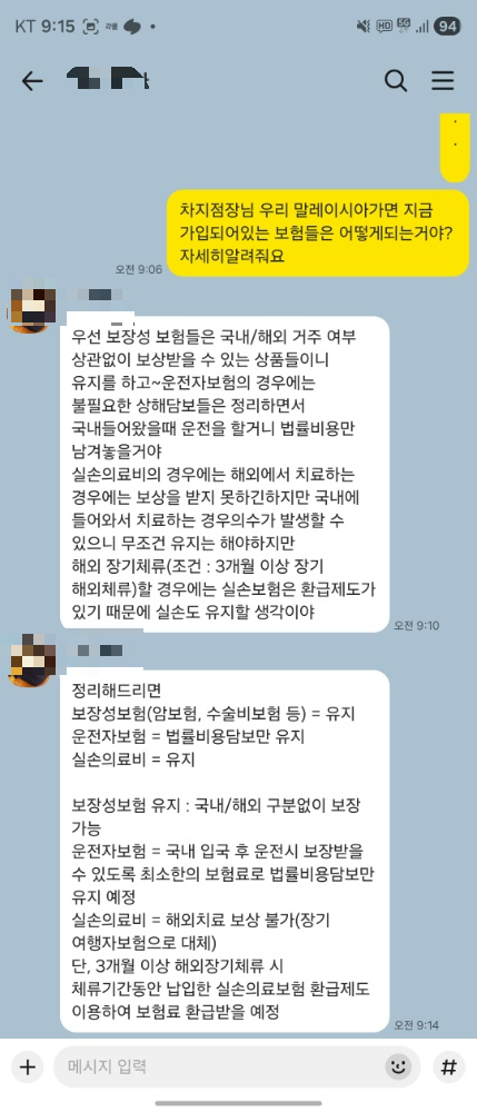 제가 지점장인 남편에게 진지하게 물어봤어요. 한국에서의 보험은 어떻게 해야 할지. 지금까지 낸돈을 무시할 수 없으니 해지하기 아까웠고, 이런 보장의 보험이 나중에 혹여냐 유병자가 되어 가입하기 힘들 수도 있어 걱정됐거든요.