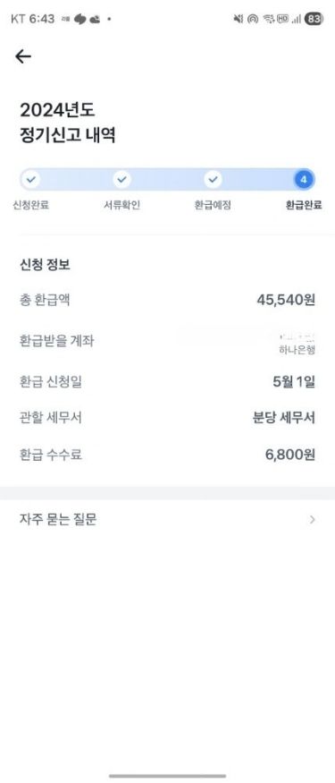 아래는 제가 토스세금서비스를 이용해 환급신청을 했을 때의 금액인데요. 소액의 수수료지만 홈택스를 이용하는 게 절대 더 번거로운 게 아니니 꼭 수수료가 없는 홈택스 직접 신고를 이용해 보세요.